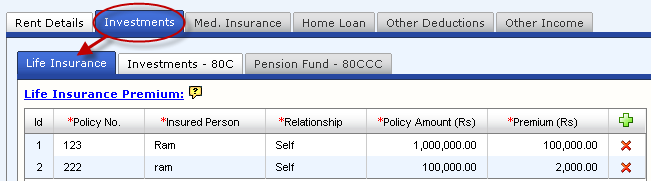 icon on top of the right extreme column in the table, you will see a row with blank fields appearing inside the table where you can enter details of life insurance premium that you have paid or will be paying for the year. Please click on the respective cells to update the details.